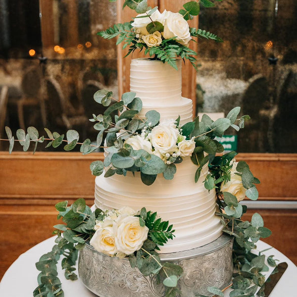 We do have a wide range of cake stands including gold/silver bases, cupcake stands, round hoops & metal tiered stands available to hire for an additional fee. We ask for a returnable security deposit, which is returned to you after you return the cake stand in its original condition to us within 3 working days of your wedding. Get in touch for more information.